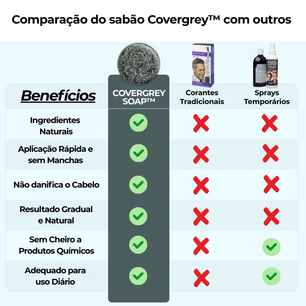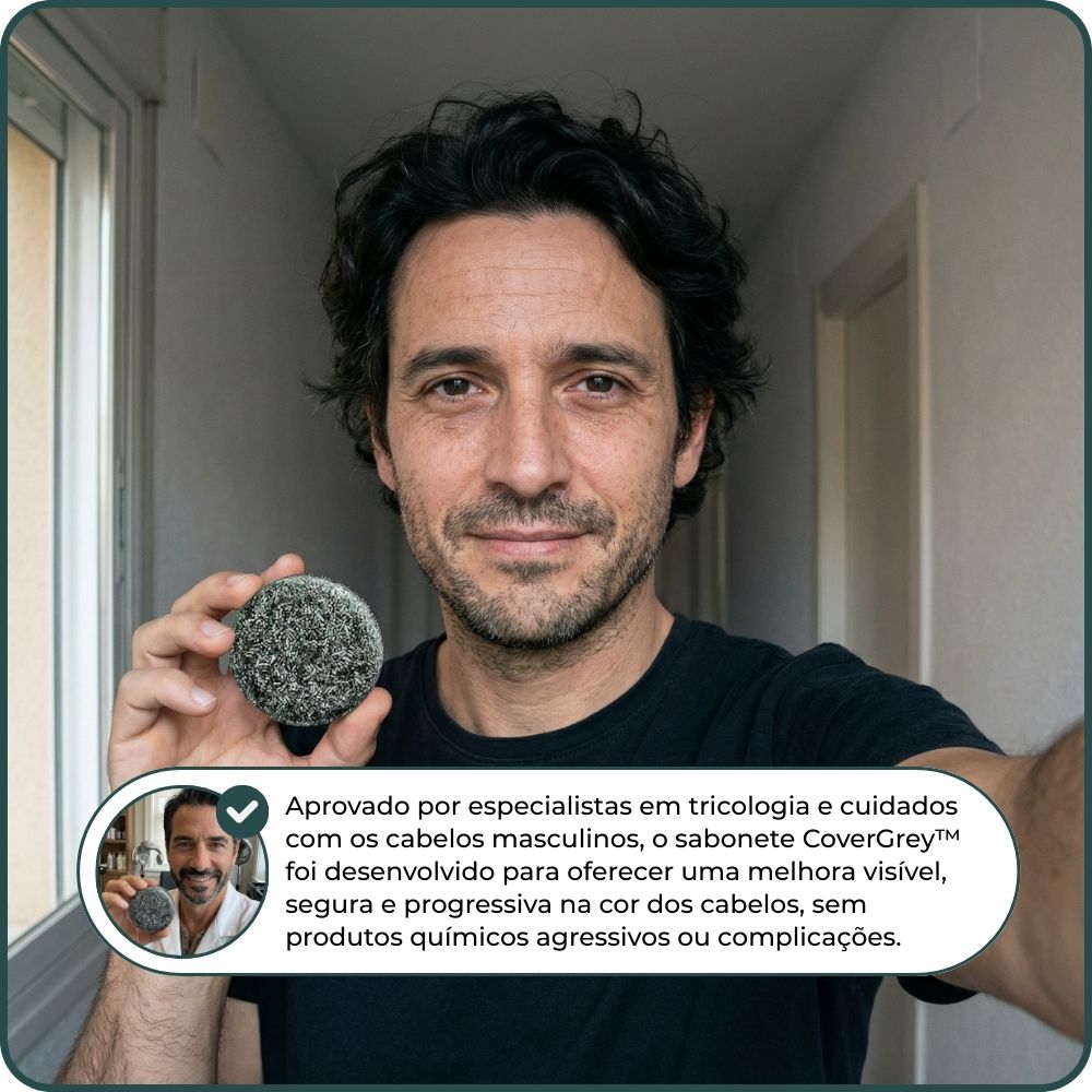 “Durante anos, vimos homens recorrerem a tinturas agressivas que danificam o cabelo. CoverGrey Soap™ é uma solução diferente: natural, prática e segura. Disfarça os cabelos brancos gradualmente, sem afetar a saúde capilar. Uma opção inovadora que recomendo.”
